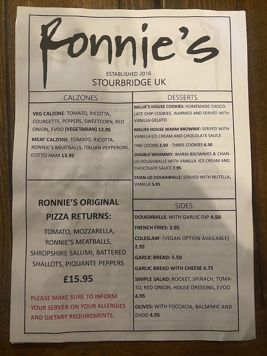 Welcome to Ronnies Wood Fired Pizza, a culinary gem nestled in Stourbridge, UK, offering a mouthwatering selection of authentic Italian pizzas. Located on the first floor at 120 High St, this charming eatery prides itself on delivering quality and flavor, using only the freshest ingredients to create an unforgettable dining experience.